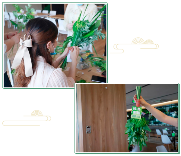 當巧手與花材不期而遇……不知不覺中,零散的花材變成了一束束的艾草花束,片片綠葉映襯出傳統佳節的悠悠思緒,絲絲繩結纏繞出節日的美好祝福。